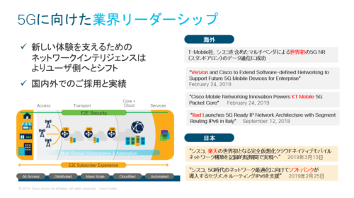 海外において、シスコは、T-Mobile 様と世界初の 5G スタンドアロンのデータ通信に成功しました。さらに、ベライゾン様、韓国の KT モバイル様、ヨーロッパのイリアド様など、主要な海外サービスプロバイダー様への支援を進めています。