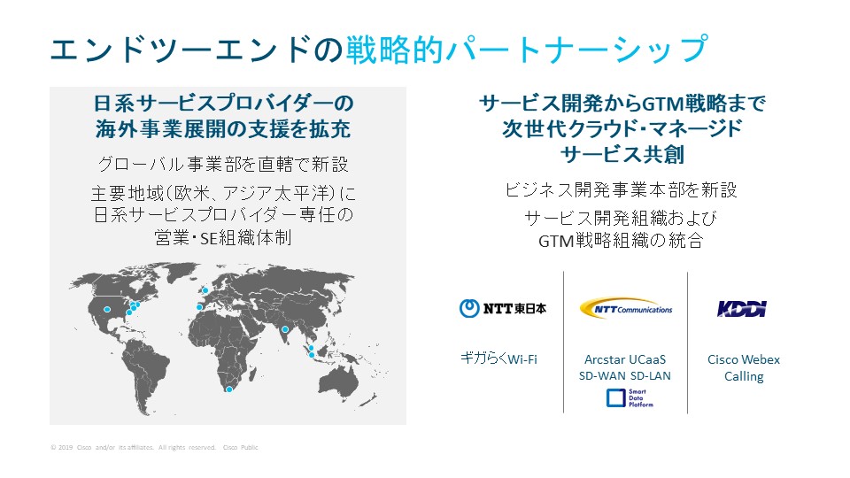 従来のビジネスインフラを含めた社内システムの構築支援に加え、新たな商材開発によるトップライン(売上)向上の支援体制を整え、シスコは通信事業者様との戦略的パートナーシップをより一層、強化してまいります。