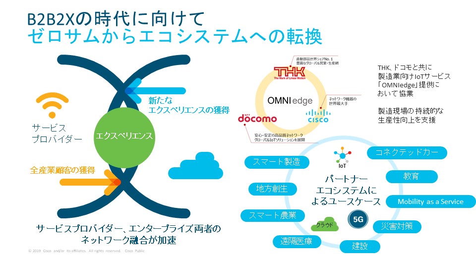 現在、シスコによる B2B2X 支援の事例としては THK 様、ドコモ様との三社協業による製造業向け IoT サービス「OMNI Edge」があります。今後、このようなユースケースをさらに拡大すべく、エコシステムパートナー様との共創の場としての 5Gソリューション ショーケースの立ち上げを進めています。今後はさらに、交通、医療、地方創生、建設などの分野においても、さまざまなパートナー様と連携を進め、ユースケースの拡大を図ってまいります。