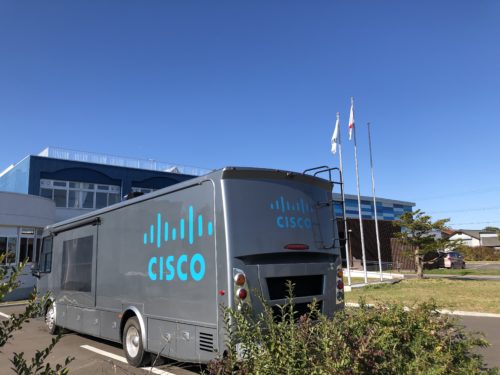 まずは、訓練のために会場へ運び入れたNevの紹介を簡単にさせていただきます。Nevはシスコのデモカー兼災害時の支援車両として全国行脚しているシスコネットワーク体験車(通称:Nev)のことです。平時は全国各地で行われているイベントで展示やテクノロジー体験、デジタルサイネージを活用したパブリックビューイングの提供などをしていますが、災害時には、災害対策本部の現地拠点として活用できるほか、Wi-FiやWebexを通じたコミュニケーション支援、デジタルサイネージを活用した避難誘導、災害関連情報の提供、自家発電による電力供給等も行うことが出来ます。