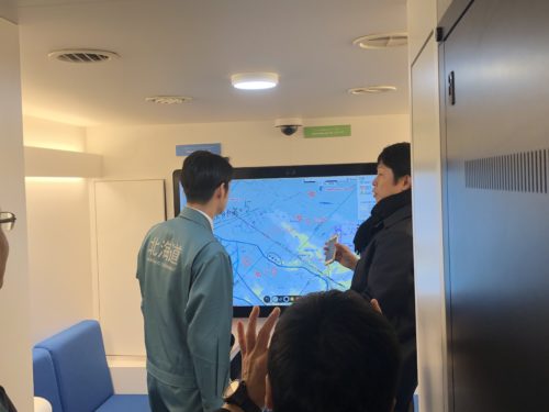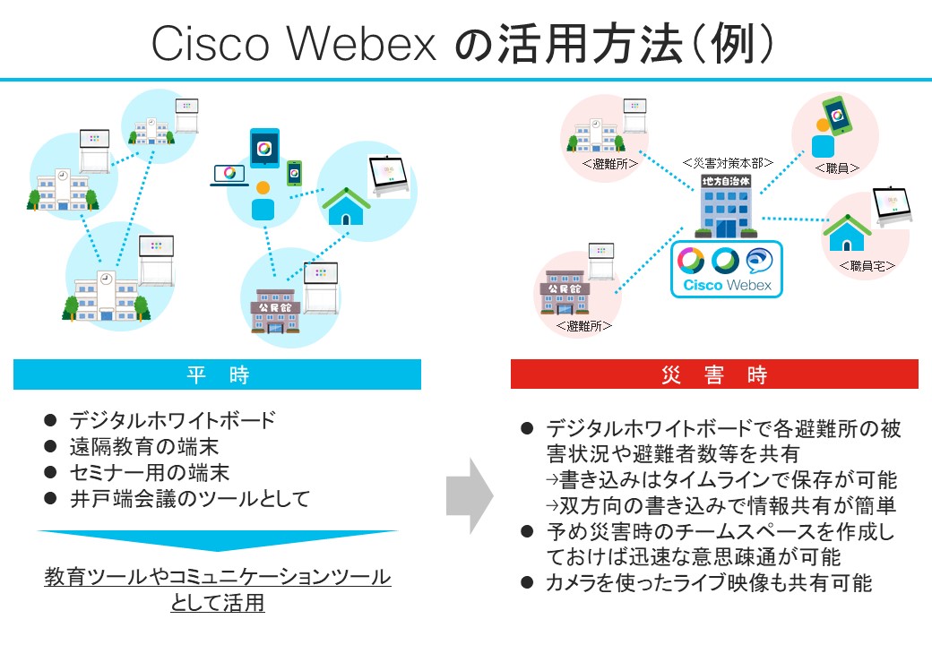 その他にも、Webex Board(デジタルホワイトボード)とWebex Teams(チャットツール)を活用してテレビ会議で現地の情報を伝えながらハザードマップに災害時の情報をまとめるデモも実施しました。このデモについては、情報の集約化と現地情報の即時伝達、情報共有化の観点から多くの関係者から好評でした。会場に訪れた鈴木直道北海道知事にもデモをご覧いただきました。また、今回の訓練では実施しませんでしたが、その他にもWebexを使って避難所と診療所等の医療機関を繋ぐことで被災者の健康チェックやメンタルケアを実施することも出来ます。