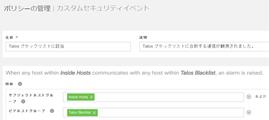 次に、上記のホストグループと通信が発生した場合にアラームがあがるように下記のカスタムセキュリティイベントを作成します。