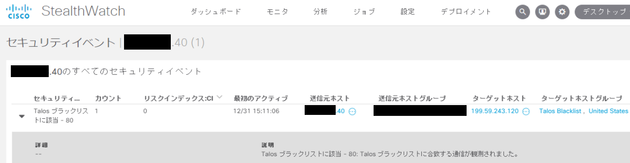 そして、Stealthwatch 監視配下の PC が該当のブラックリストと通信すると、先に作成したカスタムセキュリティイベント設定により検知できます。