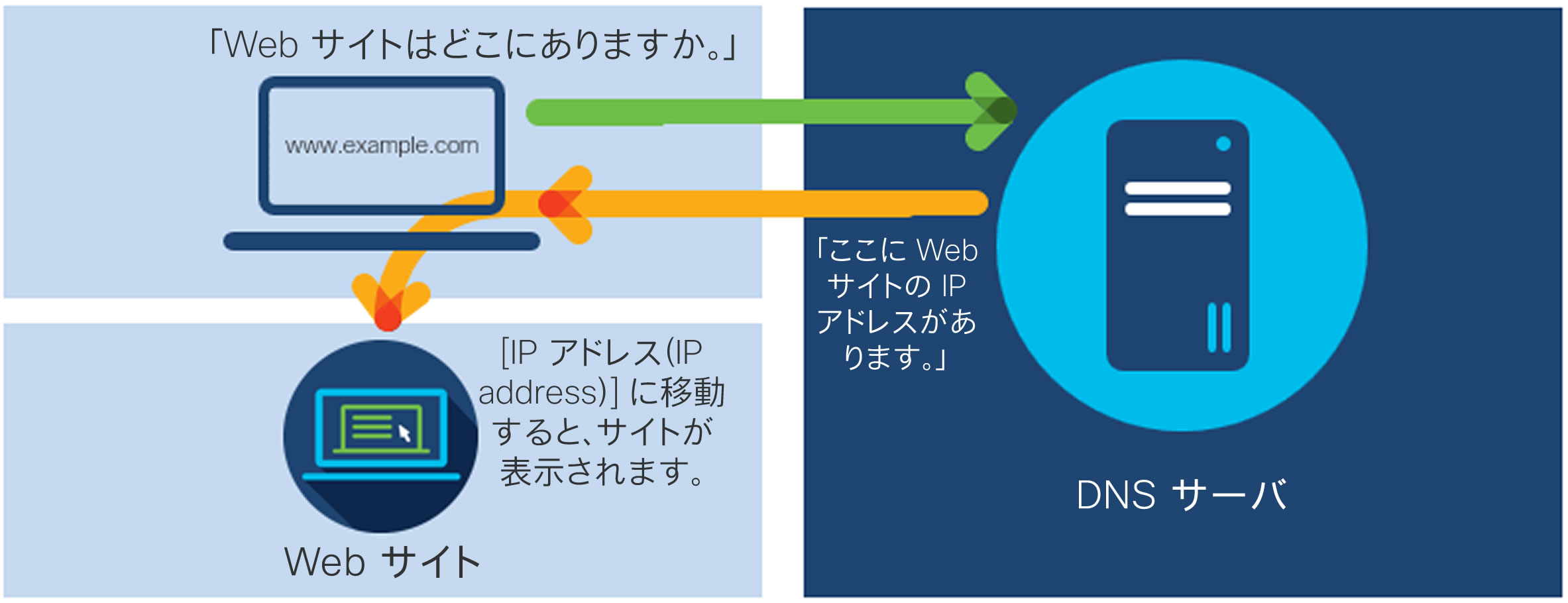 この観点から DNS は一種の通訳だとも言えます。人間が判読可能なドメイン(www.example.com など)を取得し、それをサイトの IP アドレス(ドメインを参照するためにコンピュータが使用する番号)と照合するからです。つまり、「このドメインの IP アドレスは何か?」という質問に答えるのが DNS です。