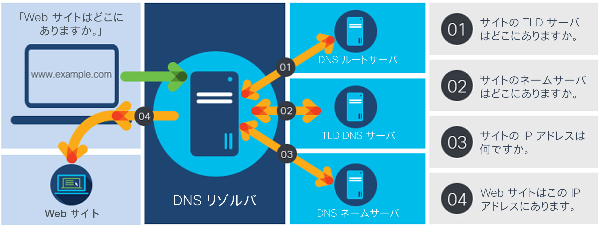DNS ルックアップの標準的なプロセスは複数の DNS サーバが関係するため、上記の説明よりも少し複雑です。最初に接続されるサーバは DNS リゾルバです。先ほどの例では図書館員が該当します。そこからのプロセスは、一般に次のようになります。