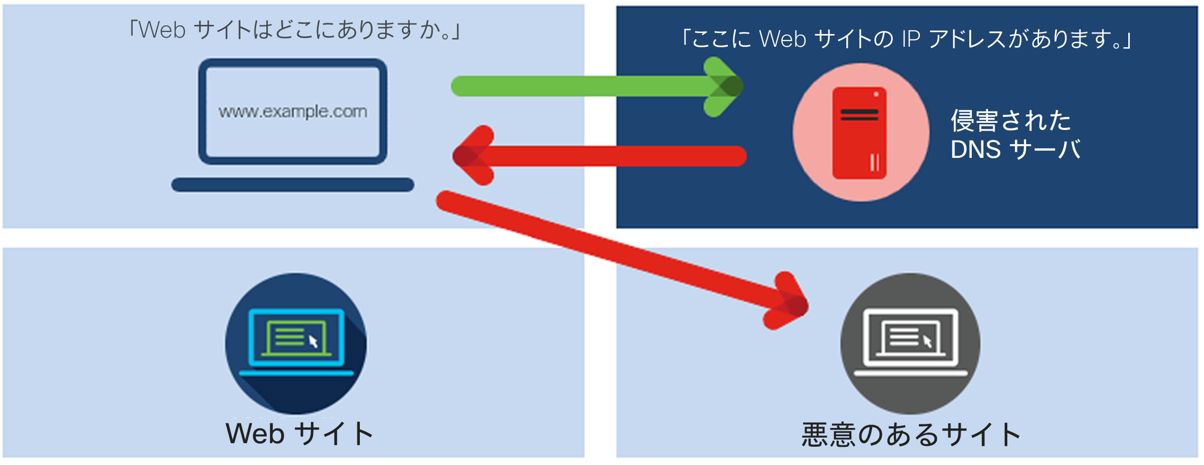 DNS 攻撃の目的は、Web サイトへの正当なルートを改ざんして不正サイトに誘導し、最終的に標的へ侵入することです。被害者は目的ドメインの IP アドレスを要求しますが、DNS レコードが改ざんされているため、実際には不正サイトの IP アドレスが返されます。