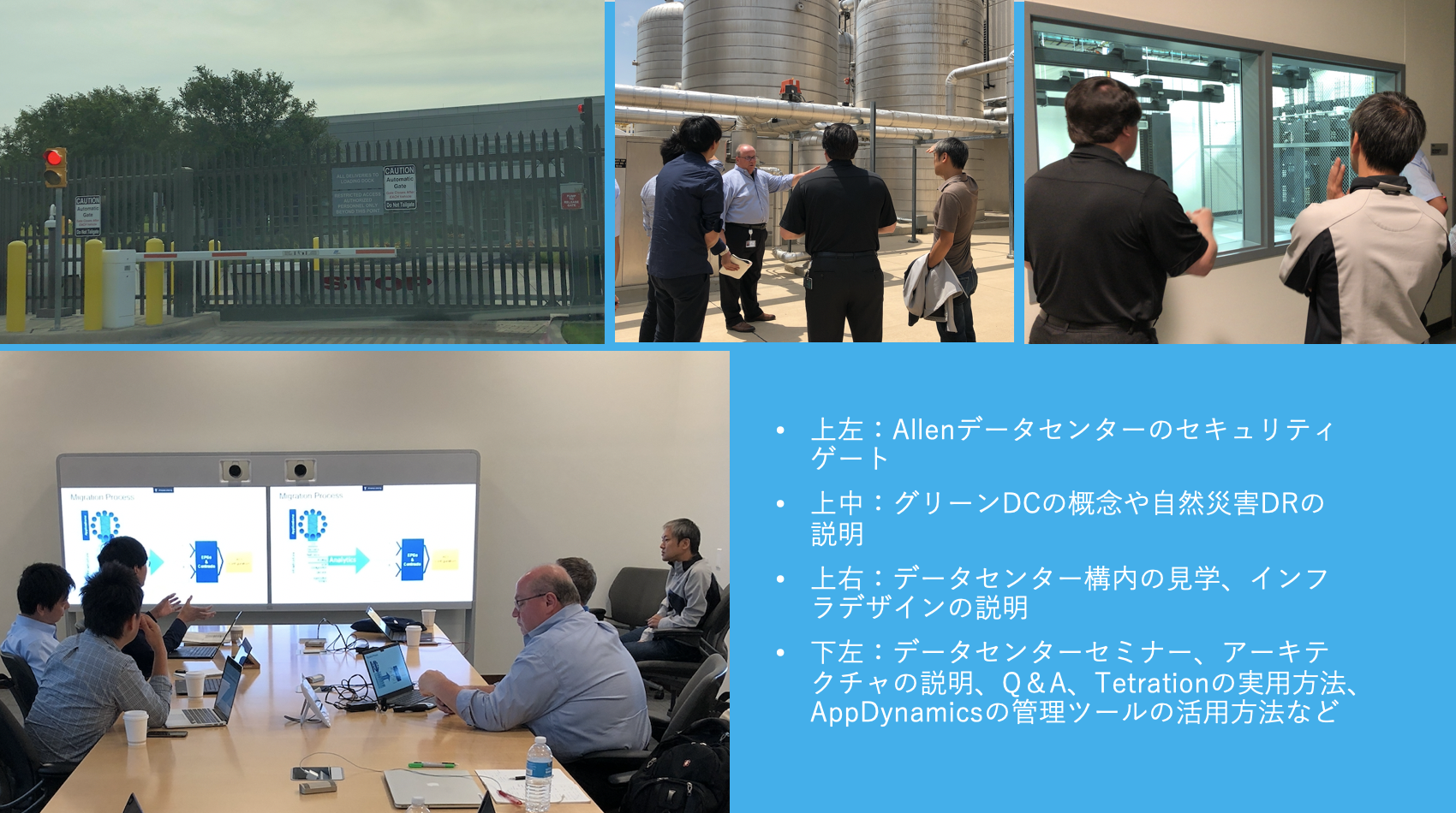 シスコライブで色々お勉強と体験を行い、一行は後半のコース – ITパートナーシッププログラム実施のため場所移動します。シスコの本番データセンターはアメリカ中部テキサス州のAllenという町にあります。San Diegoから3時間の飛行機を乗り、Dallas空港を到着後、1時間の車移動でAllenデータセンターに着きます。ここはシスコの殆どの主要アプリやインフラが集約しており、本社San Joseを人の頭脳と例えるなら、Allenデータセンターは心臓部とも言えるでしょう。ここの見学や駐在エンジニアとの対談は、最新鋭のデータセンターのアーキテクチャとテクノロジや、ビジネス機能への意義、AIとマシンランニングがデータセンターでの活用など、様々な課題の理解と深掘りすることができます。大事な場所ですので、一般の方のご見学はお断りしています。今回はITパートナーシッププログラムの参加者へ特別に開放し、さらに駐在エンジニアからのセミナーやQ&Aセッションも用意して貰いました。