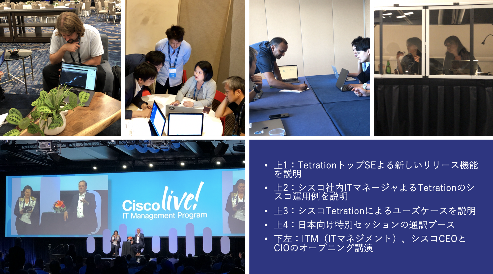 シスコは四半期毎にアメリカ、ヨーロッパ、アジアのサイトでシスコライブを行う事はご存知のお客様も多いかと思います。シスコライブで、シスコ役員の基調講演が毎回満員御礼で、そこで最新のITテクノロジと製品の発表や、シスコの1、2年先の戦略をいち早く役員のスピーチから直接説明して貰う事ができます。そして主会場には、シスコの製品の展示や、説明会、体験会、Q&Aコーナーが設けられています。シスコのテクノロジを利用して、どのようにビジネスをサポートし、加速させるユーズケースのセミナーセッションも100以上用意されています。その華やかなシスコライン主会場の隣には実はもう一つ大イベントがあります。それはITM(ITマネジメント)という、グローバル社内情報システム部が主催するITのプロフェッショナル勉強会であります。その会は一週間に渡り30以上の専門セッションを組み、ITガバナンスを始め、ITセキュリティ、データセンター、クラウド、ネットワーク、コラボレーションツール、AI・MLなどトピックを、最新のコンテンツやシスコの社内IT実用データを交えて、参加者の皆さんに届いて説明されます。そして、折角シスコ各分野のエキスパートとお客様が同じロケーションに集まっているので、予約すれば専門家を時間キープして、お客様が興味あるもの、深掘りしたいトピックの個室相談ができます。また、日本のお客様だけに開設した特別セッションもあり、そこで通訳付きでセミナーと情報交換を行えます。