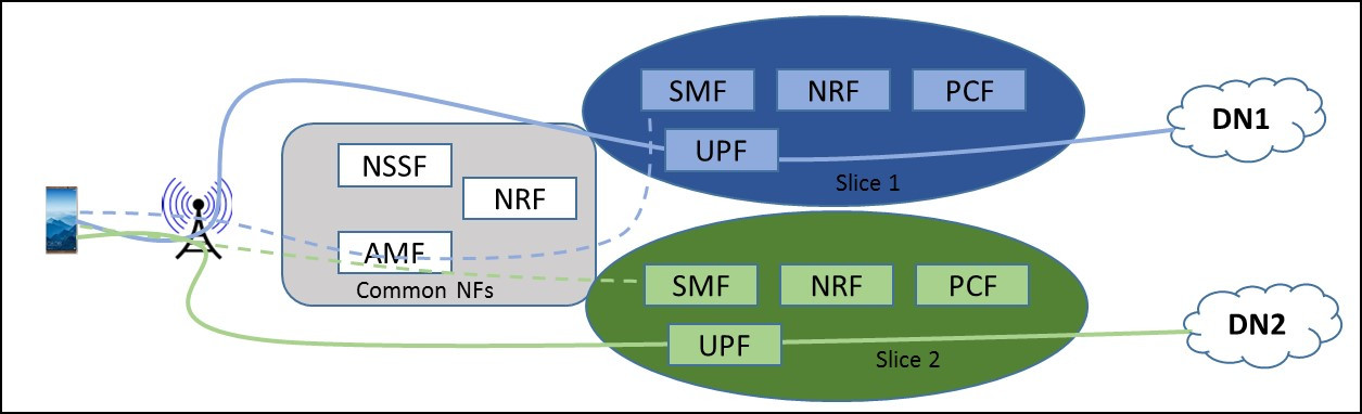 - ネットワークスライスは、RAN 部分と CN 部分から構成される