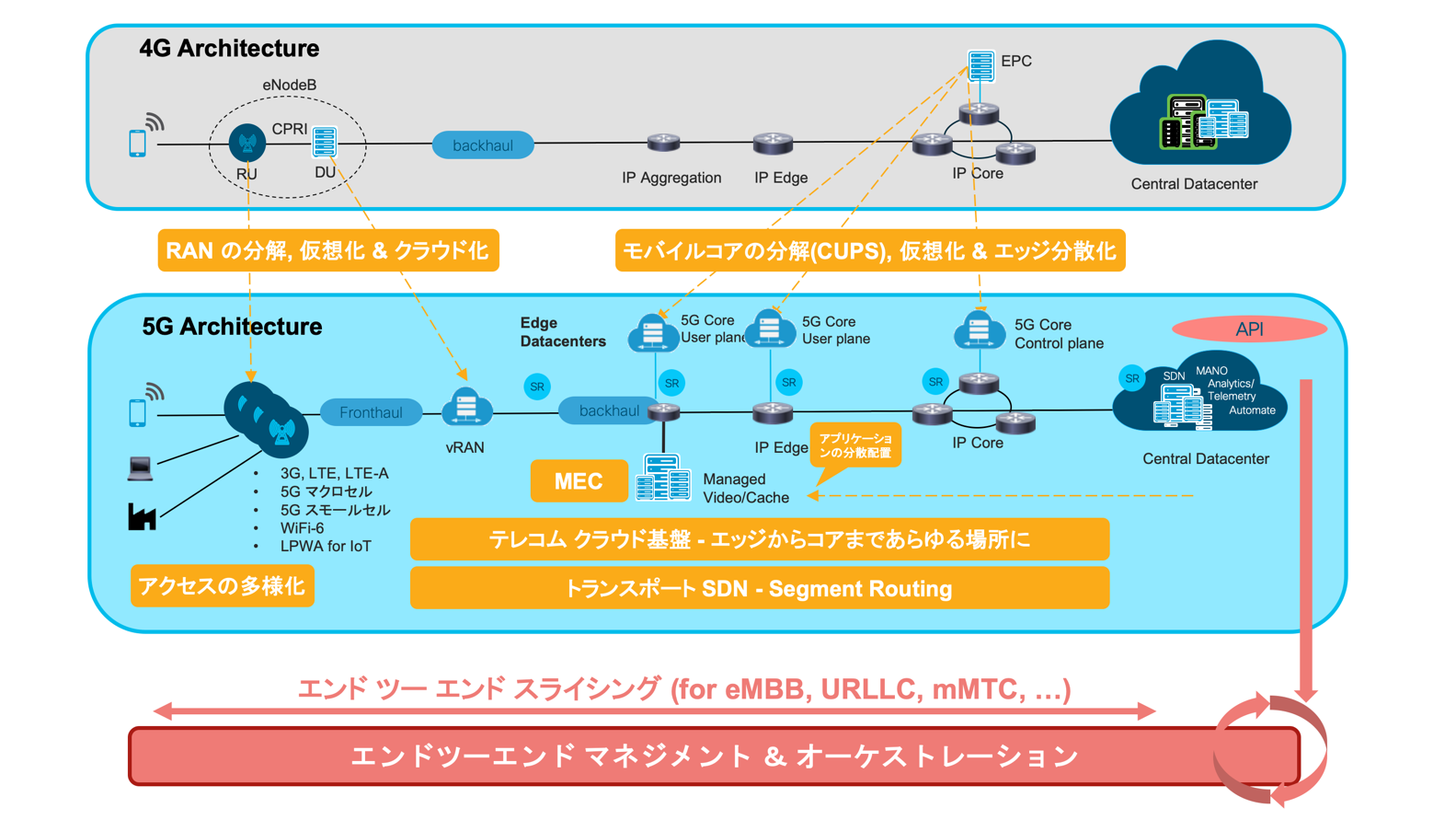 図 6-1 に、これまでの章で見てきた 5G でのシステム アーキテクチャの変革の全体像を示しました。各セクションで見たポイントを整理してみます。