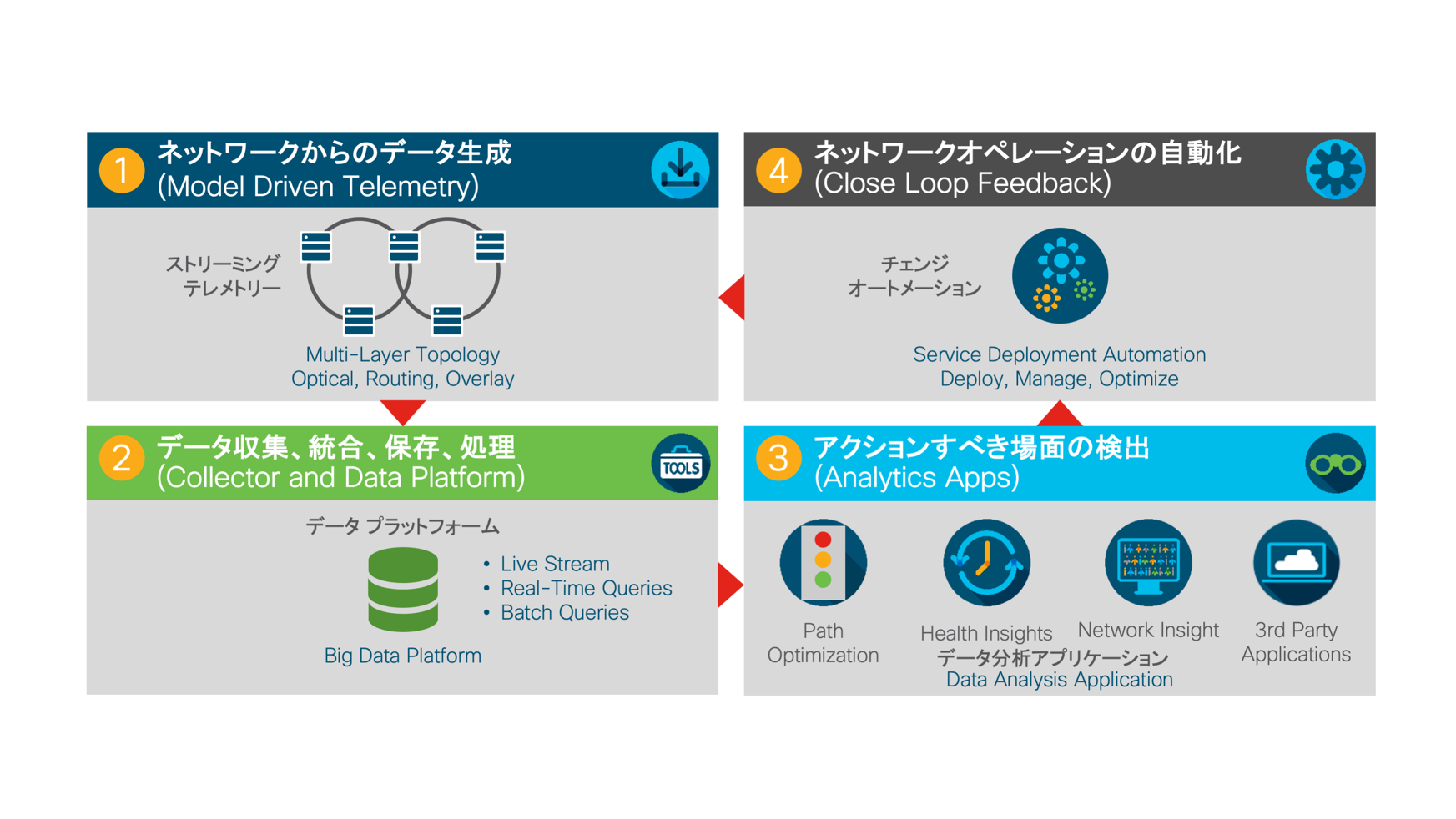 - ネットワークの各レイヤごとに、統計データやログを収集する仕組みが必要です。従来と異なるのは、人と違いプログラムが理解できる構造化データが出力されることが求められる点です。また、各レイヤの正確な状態を判定するためには、従来よりも高精度のデータを収集する必要もあります。これにはストリーミング テレメトリ[2] と呼ばれる技術が用いられます。