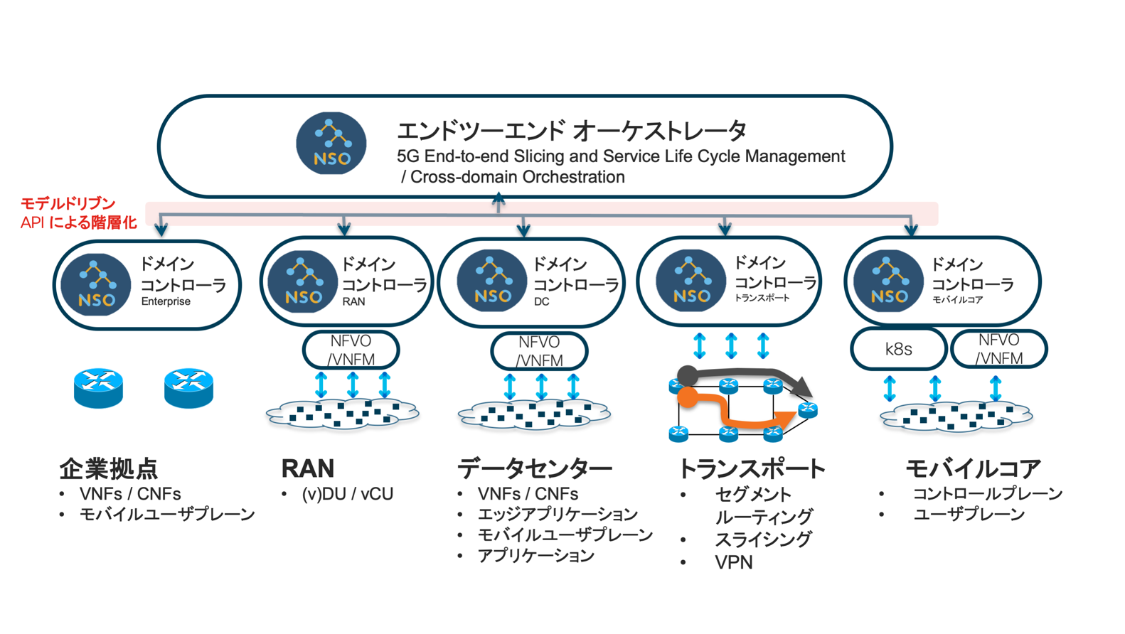 第 5 章(ネットワーク スライシング)で触れたように、エンドツーエンド スライシングは、ネットワークの各ドメイン (RAN、トランスポート、DC ファブリック、モバイルコア)ごとに配置されたドメイン コントローラと、中央に配置されたエンドツーエンド オーケストレータが連携しながらプロビジョニングおよび運用・監視を行うことが想定されています。