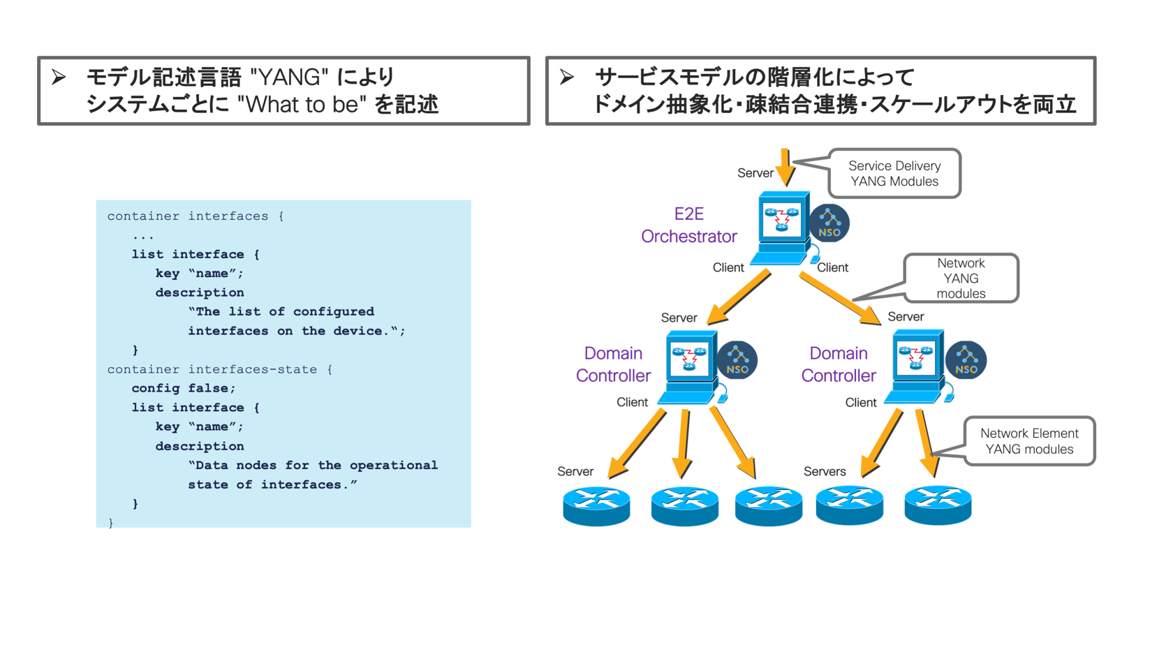 ここで大事なことは、各ドメイン内の自動化にあたっても、ゴールであるエンドツーエンド オーケストレーションを見据えた設計を採用することです。それぞれのドメインが自由に自動化を設計してしまうと、ドメイン間の連携時に多大な開発コストがかかるおそれがあります。そこで、各ネットワーク ドメイン内でそれぞれ完結したクローズド ループを構築しつつも、各ドメインのオーケストレータが外部向けには抽象化したサービス モデルを提供することが重要です。これにより、ドメイン間を疎結合の API で相互連携させることが可能になります。