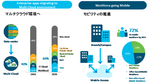 企業の情報システム環境も大きく変わっています。複数のクラウドサービスの利用が当然となり、また、固定の配線を最少化するのは勿論、場所にかかわらず、移動中であっても、システムを効率よく安全に利用できることが必須になっています(図 7-1-1)。