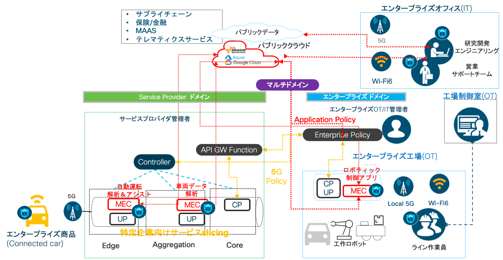 図 8-2 は、スマート ファクトリーへの活用および製造業へのデジタル トランスフォーメーション推進について示しています。右側が対象となる自動車製造ベンダーの企業ドメインになっており、一般的な IT 部署が管理するオフィスと OT(Operation Technology)部署が管理する工場のフィールドを示しています。また、左側がモバイル サービス事業者のドメインです。ここでは協業する自動車製造ベンダー向けのスライスを作成しており、5G では商品であるコネクテッド カーや従業員の接続サービスを提供しています。これら 2 つのドメインがどのように連携し、企業側のトランスフォーメーションが推進されるかを見ていきたいと思います。