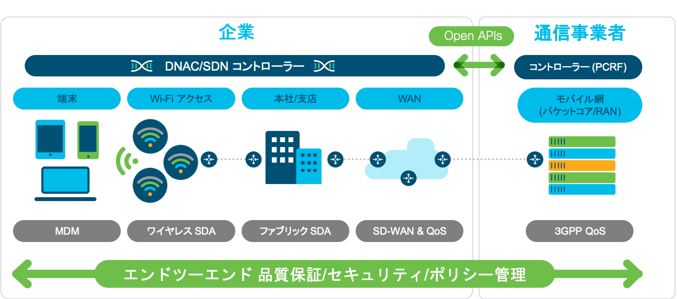 シスコは、エンタープライズ事業者がモバイル サービス事業者に対して、自社のネットワーク同様、5G 環境においてもモバイル端末の一貫したセキュリティ ポリシーの適用を求めている点を考慮し、API 連携を提唱しています。例えば、5G Coreのポリシー制御機能と DNA-C を API を介して連携させることにより、モバイル端末の位置情報と DNA-C からのポリシー情報を参照して、モバイル端末のコントロールを行うようなことが可能になります。(詳細は第 7 章参照)