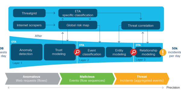 ネットワークシステムに何が起こっているかを把握するために、可視化が重要です。現在は暗号化されるトラフィックが増えており、Let’s Encrypt の統計 [12] によると、2019 年には Firefox で読み込まれたページの約 80 %が HTTPS となっています。このため Packet Inspection でトラフィックを解析することは無意味となり、Flow base の解析が重要視されるようになりました。ここでは Flow base の可視化・分析ツールとして、ETA(Encrypted Traffic Analysis)を紹介します。ETA はトラフィックが暗号されていても、フローの振る舞いを検知することにより、異常性を検出します。