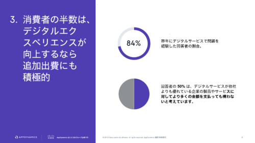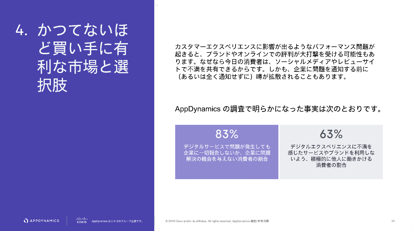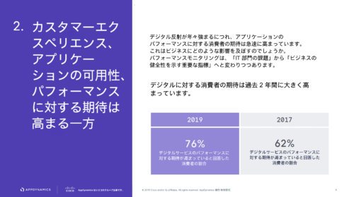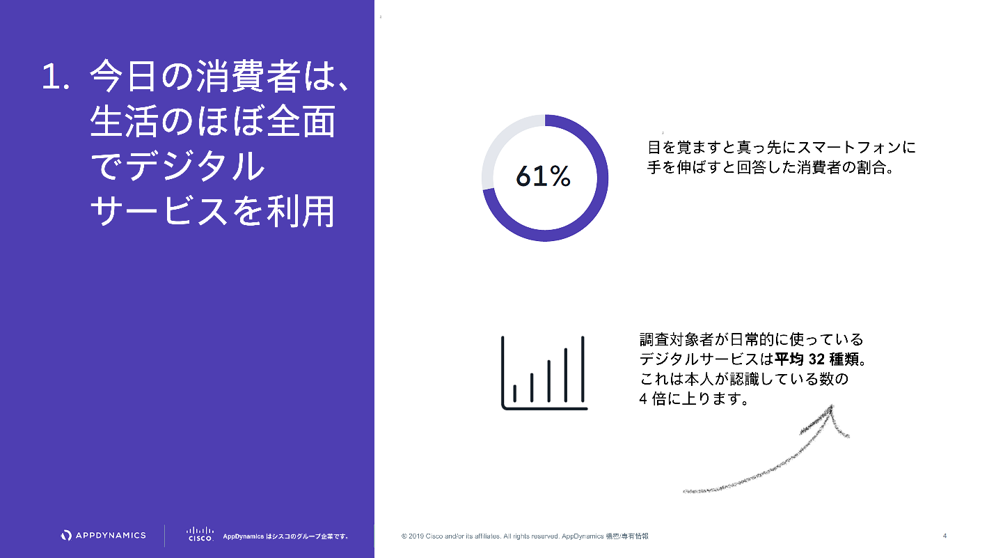 デジタルサービスのインパクトとパフォーマンス モニタリングの役割を把握するため、AppDynamics では 7,000 人を超える消費者を対象に調査を実施しました。米国と英国で実施した 2,000 件、およびドイツ、フランス、オーストラリアの各国で実施した 1,000 件が含まれています。調査から得られたデータに基づき、『アプリケーション注目指標 2019』という画期的なレポートを公開しました。レポートでは、デジタル行動に関連する新たなトレンドや意識について総合的に分析しています