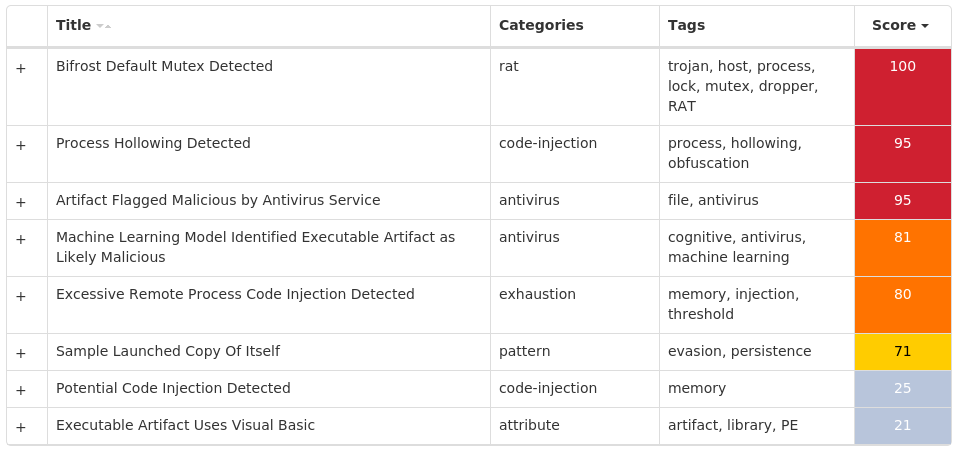 | Win.Dropper.Bifrost-7646061-0 | ドロッパー | Bifrost はバックドアで、10 以上の亜種が存在しています。標準的なサーバ、サーバビルダー、そしてクライアントのバックドアを組み合わせることで、(そのクライアントを使用する)攻撃者が侵入先で任意コードを遠隔実行できるようにします。Bifrost は一般的な RAT 機能(ファイルマネージャ、スクリーン キャプチャ ユーティリティ、キーロギング、ビデオ録画、マイクとカメラの監視、プロセスマネージャ)を備えています。システムに侵入した場合、「Bif1234」または「Tr0gBot」という名のミューテックスを使用します。 |