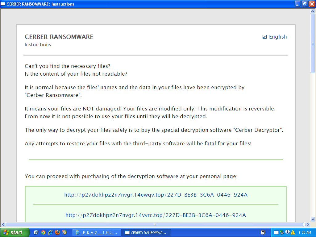 | Win.Ransomware.Cerber-7649513-1 | ランサムウェア | Cerber は、ドキュメント、写真、データベースなどの重要なファイルを暗号化するランサムウェアです。これまではファイルを暗号化し、ファイル拡張子に「.cerber」を追加していましたが、最近の攻撃では他の拡張子が使われています。 |