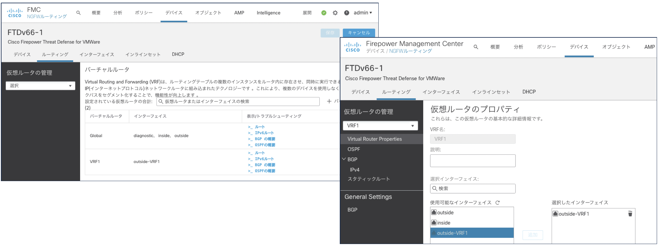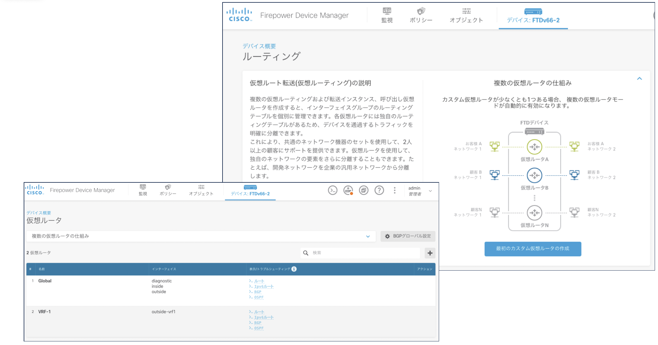 以外の FTD で、ルーティングドメインを分割する VRF に対応します。これにより、FTD 配下で IP アドレスが重複していても、そのインターフェイスを異なる VRF に属させることで、この問題を解決できます。Firepower 4100 / 9300 でサポートされるマルチインスタンスとの併用も可能です。