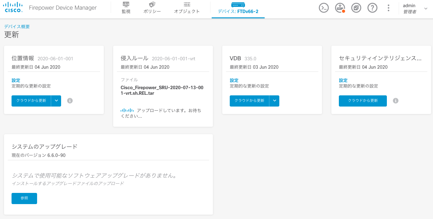 また、FDM で管理している FTD デバイスにおける各種アップデートファイル (SRU, VDB, 位置情報 等) は、FTD が直接シスコのサイトからダウンロードするしかありませんでしたが、バージョン 6.6 からは、管理者が事前にダウンロードしたファイルをローカル PC から FTD に手動でアップロードすることもできるようになりました。