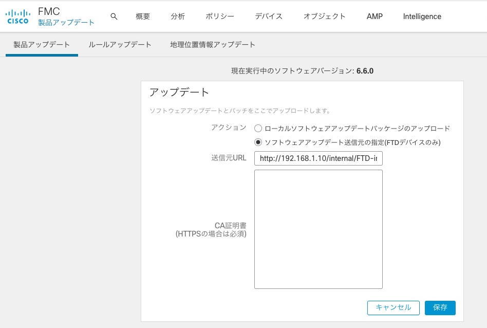 FMC で管理している FTD デバイスのバージョンアップ実施時の使うアップデートファイル (イメージファイル) は、FMC がシスコのサイトから直接取得するか、あるいは管理者が事前にダウンロードしたファイルをローカル PC から FMC に手動でアップロードするしかありませんでした。バージョン 6.6 からは、管理者が準備した内部の Web サーバからのイメージ取得、という方法が可能になりました。