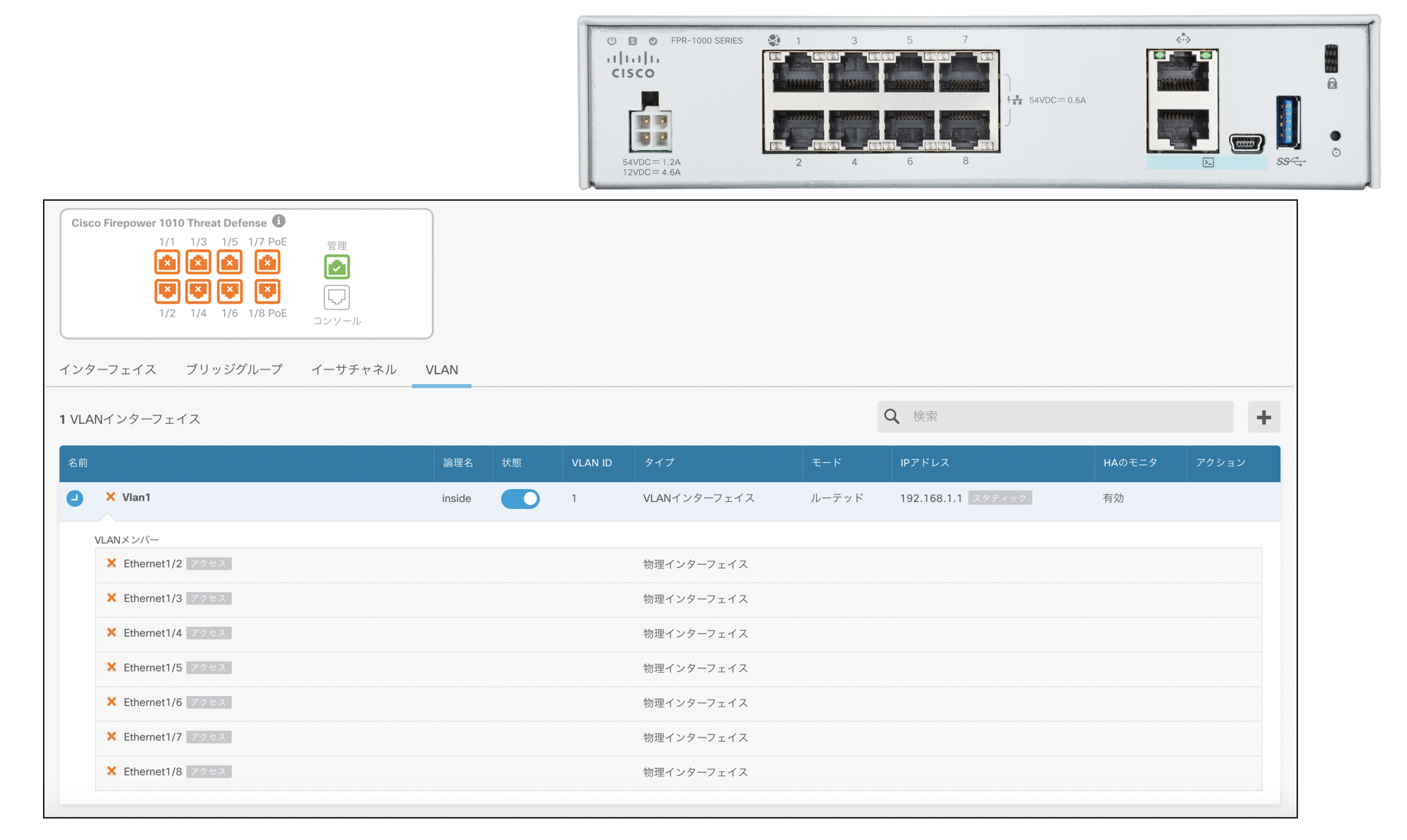 Firepower 1010 のポート構成と FDM のインターフェイス設定画面