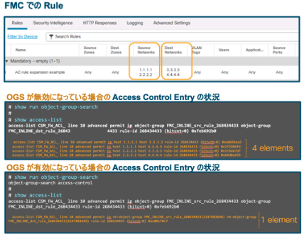 ASA でサポートされていた Object Group Search (OGS) が、FTD バージョン 6.6 で Access Control Policy に適用可能になりました。OGS は、Object の中身が多く、Access Control Entry に Object の中身まで広げて FTD のメモリに保有すると、メモリ使用量が増えてしまうような場合に利用します。OGS を有効にすると、Object の中身は展開せずに、ルール内に Object のままで Access Control Entry として保持し、そのルールを評価 (適用) する際に、都度 Object の内容を探す、という動きになります。つまり、メモリ使用量を節約し、代わりに CPU 使用率が上がる、という結果になります。OGS はデフォルトでは無効です。必要に応じて有効にしてください。また、FDM で OGS を有効にする場合、FlexConfig での設定になりますのでご注意ください。