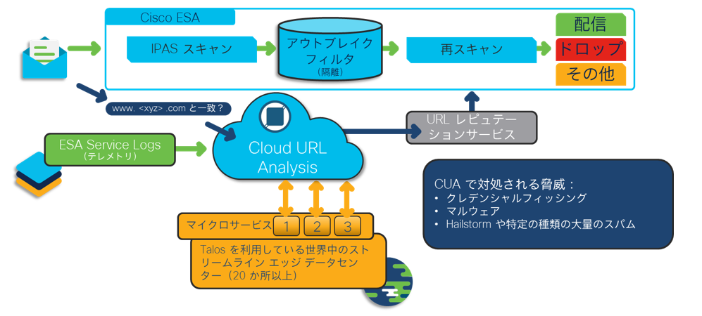 また、なりすましにより偽サイトに誘導してアカウント情報や機密情報を盗み取るURLフィッシング対策としては、図3で紹介した対策に加えて、最新のESAのバージョン(AsyncOS 13.5)より、Cloud URL Analysis(CUA)が実装されております。CUA ではTalosとの連携がより強化され、既存の URLレピュテーション情報を内外のツール、インテリジェンス情報を含めてさまざまな分析手法と統合し、URL 自体の構造からドメインやページのコンテンツに関する情報に至るまで細かく分析することにより、URL ベースの多様な攻撃を検出することができます。結果としてフィッシング検知精度が更に向上しております。