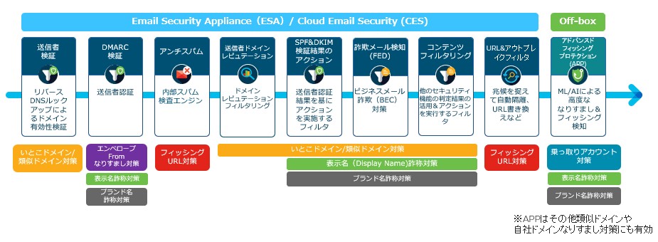 Cisco Email Securityではこうした様々ななりすまし攻撃を防ぐためのセキュリティ機能を下記の通り実装しております。