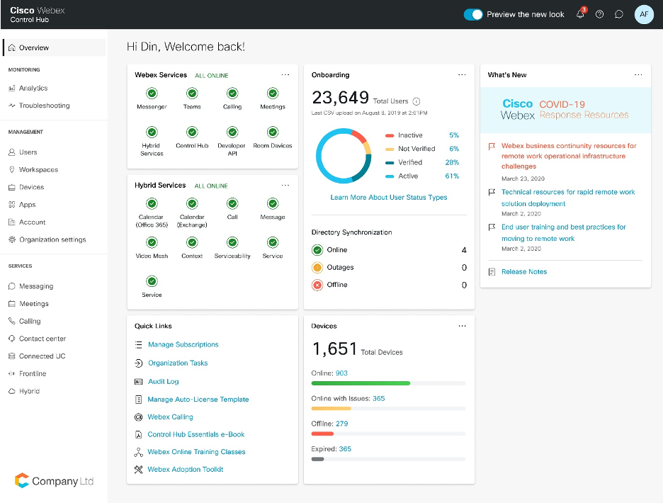 Cisco Webex Control Hubは、アカウント管理、セキュリティ設定、デバイス管理を1か所で行うことができ、Cisco Webex プラットフォーム全体にわたる管理機能を単一のサイトで提供します。この統合管理により、豊富な定量データが提供されるため、IT管理者はユーザの利用状況を細かく把握したり、サービス品質の問題をリアルタイムに解析したりすることが可能となります。