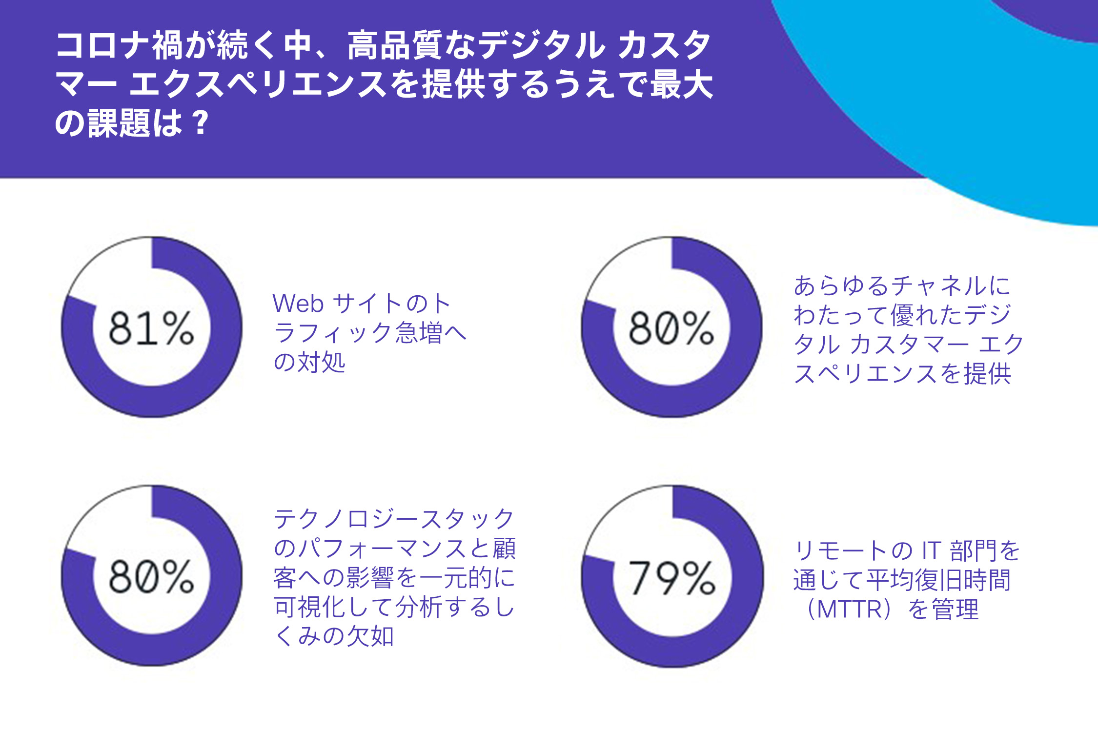 80% の技術者は、アプリケーションとデジタルサービスのパフォーマンスを維持することがパンデミック中のビジネスには不可欠であると考えています。その一方で、同じ割合の技術者が、テクノロジースタックのパフォーマンスを可視化して分析する仕組みがないため、適切に対処できていないと述べています。