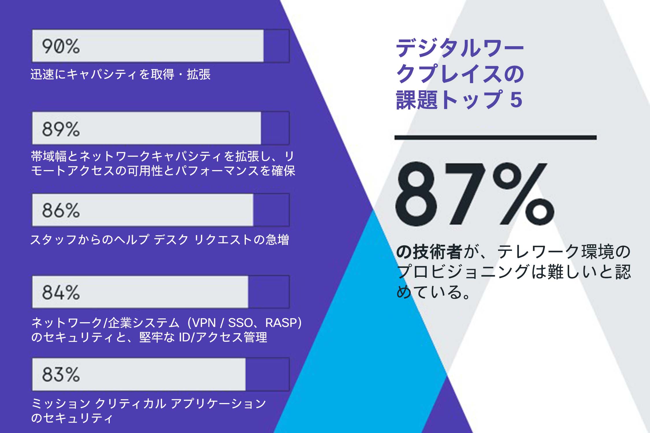 本調査により、技術者たちがあらゆる方面からプレッシャーを受けていることが明らかになっています。デジタル化をスピードアップし、従業員の大部分を在宅勤務に移行させると同時に、ネットワークを管理して、テクノロジースタック全体のセキュリティを維持しなくてはならないからです。