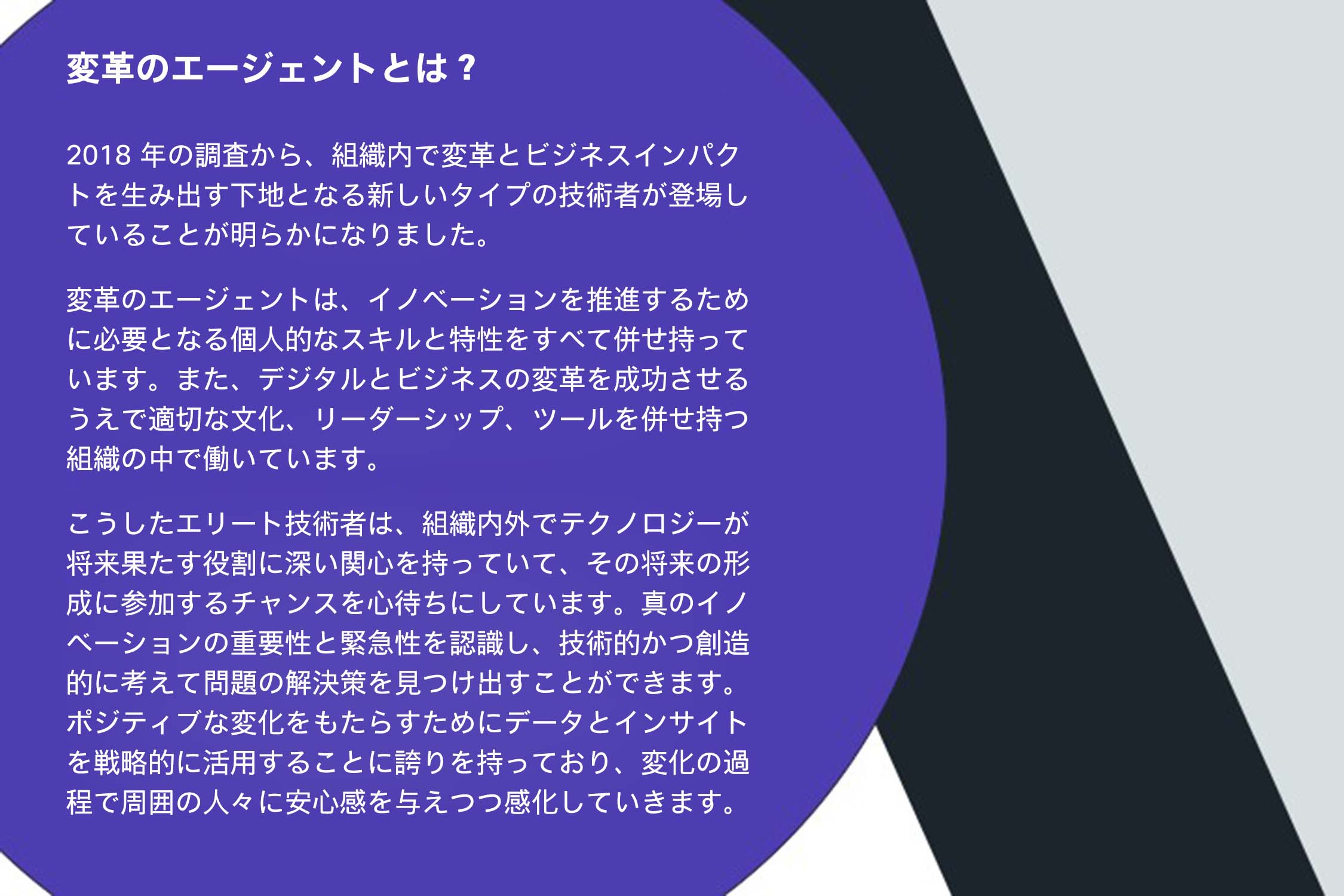特に、ビジネスリーダーや IT リーダーは、今の極めて困難な状況においても、デジタル変革やイノベーションを推進できるだけのスキル、ビジョン、決断力を併せ持ったエリート技術者を見極めて、的確にサポートする必要があります。コロナ禍から生じた前例のない課題に対処できるのは、「変革のエージェント」と呼ばれる、こうしたエリート技術者たちだけなのです。