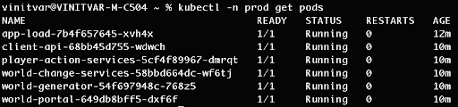「prod」名前空間で実行されているアプリケーションを以下に示します。