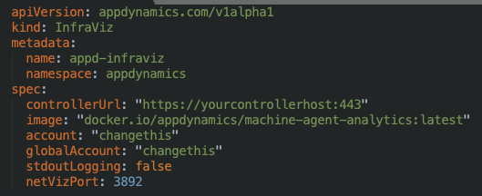 先ほど述べたとおり、インフラストラクチャの可視性(InfraViz)をクラスタエージェントと併用する場合は、enableDockerViz: “false” を追加します。InfraViz を展開すると同時に、この例のように、ネットワークの可視性または分析のマシンエージェント拡張および設定を有効にすることもできます。