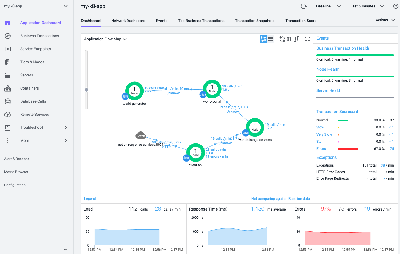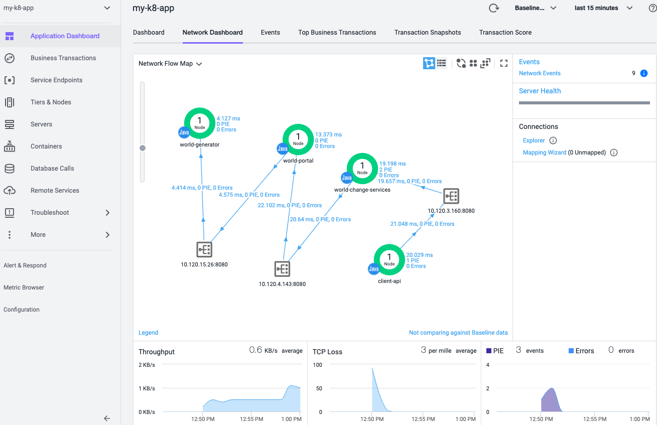 - AppDynamics コントローラ全体にわたって、新たなユーザエクスペリエンスを実現。トランザクション、ネットワーク、ノード、ポッド、コンテナのレベルでエンティティ間をすばやく移動してメトリックを参照し、相関関係を分析して、パフォーマンス上の問題が生じている根本的な原因を特定できます。