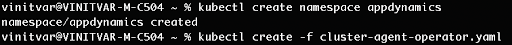 最初のステップは、AppDynamics オペレータを展開することです。このオペレータは Kubernetes API のクライアントであり、クラスタ内のカスタムリソースのコントローラとして機能します。download.appdynamics.com からクラスタエージェントをダウンロードする際に、cluster-agent-operator.yaml をダウンロードできます。