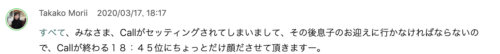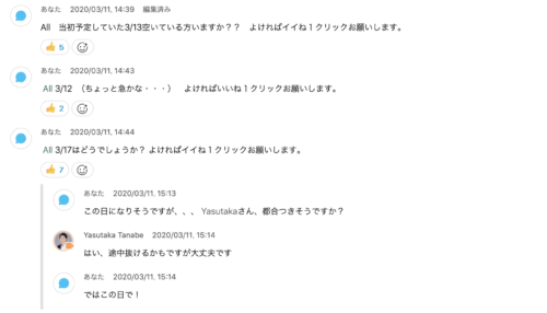 候補日程を記したコメントへのフィードバックの有無で参加可否を確認します。