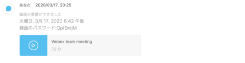 終了後しばらくして、録画のリンクとパスワードが自動的にWebex Teamsのスペースに掲載されます。スペースに参加しているメンバーはこの再生ボタンをクリックして録画再生することができます。