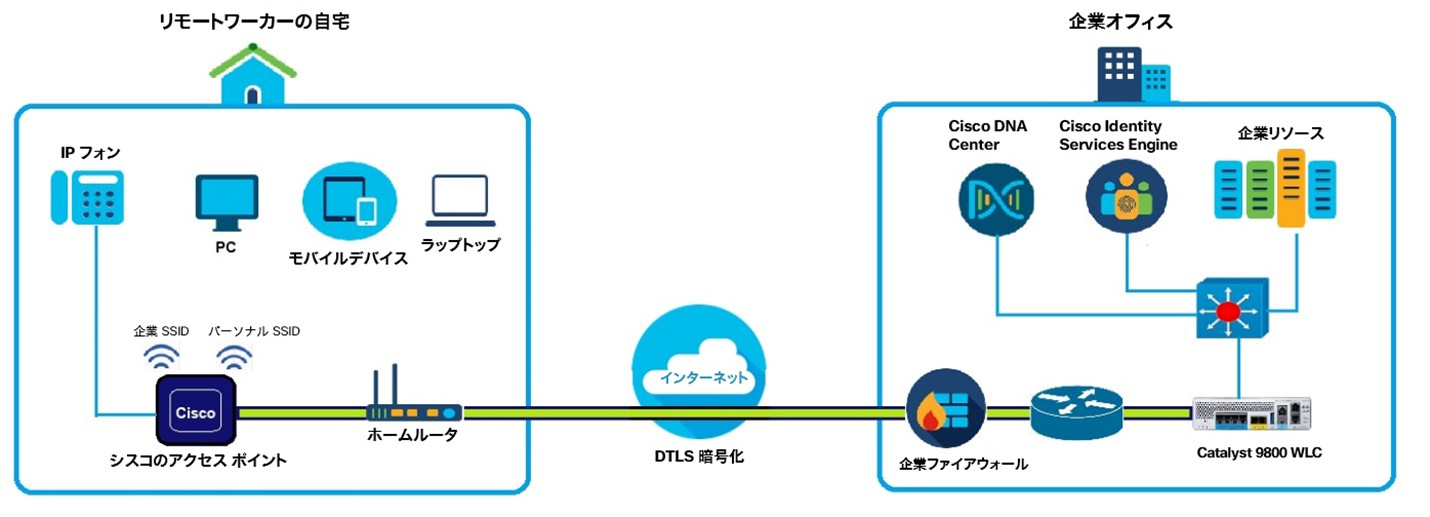 シスコのリモート ワークフォース ワイヤレス ソリューションを導入すれば、安全かつスケーラブルで、管理が容易な社内 WLAN をインターネット経由でリモートワーク先にまで拡張できます。これにより、リモートワーカーは普段のワイヤレスプロファイルを使用するだけで自宅からプライベートネットワークへ安全に接続できるようになります。VPN やその他のリモートアクセスを設定する必要はありません。つまり、自宅のワイヤレスネットワークが瞬時に企業ネットワークとなり、社内リソースを簡単に利用できるようになるのです。
