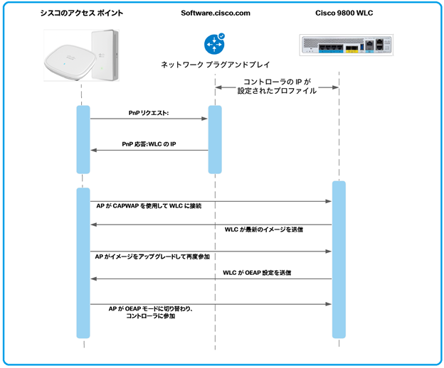 管理者はシスコのネットワーク プラグ アンド プレイ(PnP)機能を使用してアクセスポイントをプロビジョニングできます。また、AP のシリアル番号ごとに定義された各 AP のプロファイルを PnP クラウドで管理することもできます。コントローラプロファイルには、社内の WLC のプライマリおよびセカンダリ IP アドレスに関する情報が含まれています。管理者は CSV ファイルを使用して AP のシリアル番号をインポートするだけで、該当する AP にコントローラプロファイルを割り当てることができます。