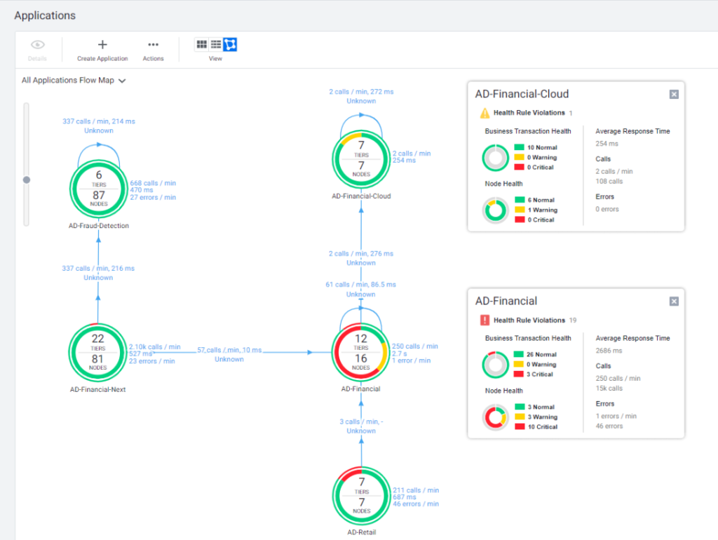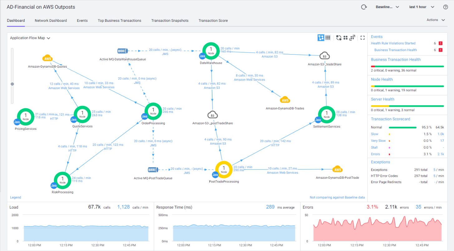 AppDynamics は、アプリケーションスタック全体にわたってエンタープライズクラスの可視性を実現することにより、AWS パブリッククラウドと AWS Outposts で運用されている AWS ワークロードのモニタリングを可能にします。さらに、AppDynamics のエージェントが AI をベースとした認識エンジンを駆使し、AWS ハイブリッドクラウド全体にわたって数十億件のトランザクションを処理することによって、アプリケーショントポロジ、依存関係、ビジネスプロセスを自動的に検出、マッピングし、リアルタイムで可視化します。