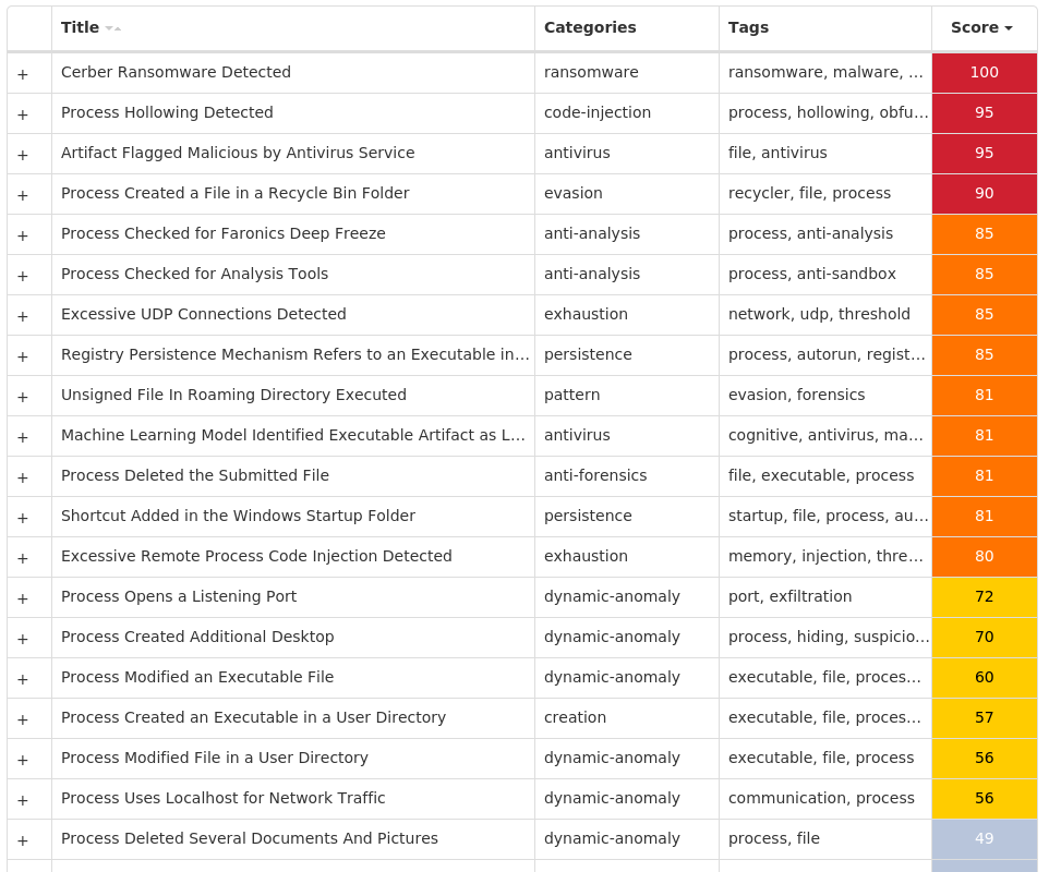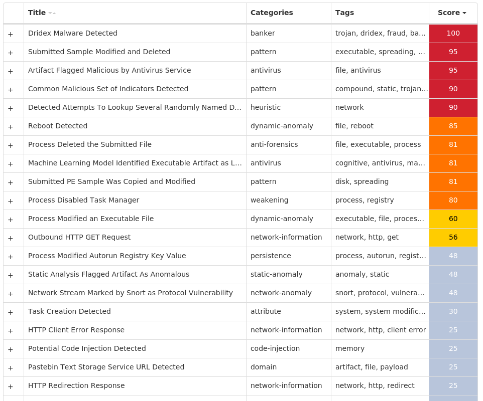 の JSON ファイルをご覧ください。MITRE ATT&CK 手口についても、脅威ごとに図示されています。図の中における手口の色が明るいほど、動的分析が行われた脅威ファイル全体で多く確認されたことを示しています。明るさは 5 段階で、最も暗いものはファイル全体で確認されなかった手口を、最も明るいものはファイル全体の 75% 以上で確認された手口を表します。