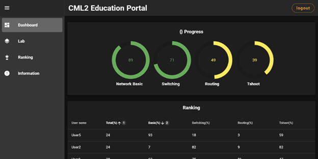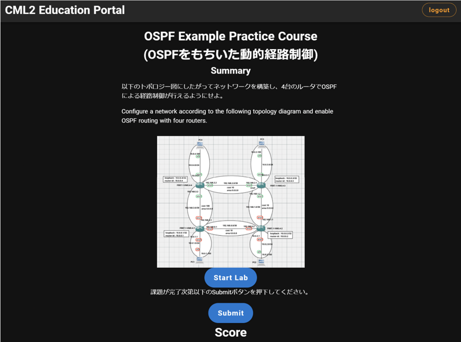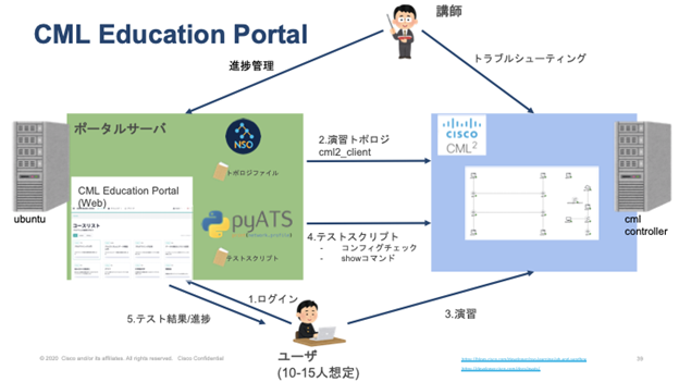 そこで、受講生がアクセスするポータル画面として CML Education Portal を作成し、シスコが提供する仮想ラボシミュレータである Cisco Modeling Labs (CML) を用いた仮想研修基盤と、テスト自動化フレームワークである pyATS を使った自動採点を組み合わせてオンライン研修基盤を作成しました。