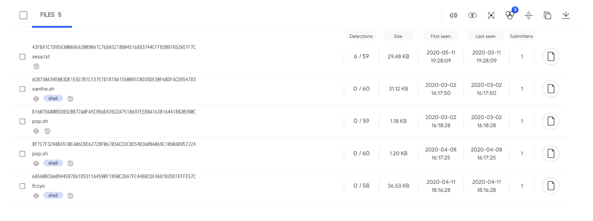 このイベントは、まだあまり一般に知られていない暗号通貨マイニングボットネットに関連しています。Talos では、メインの拡散スクリプトのファイル名にちなんで、このマイニングボットを Xanthe と呼んでいます。オープンソースの情報を調査したところ、このボットが出現し始めた当初にいくつかのサンプルが少数のマルウェア対策エンジンによって検出されていたことが VirusTotal でわかりました。Xanthe は実際には 2020 年 3 月から継続的に活動していたにもかかわらず、検出されたスクリプトは 1 件のみでした。