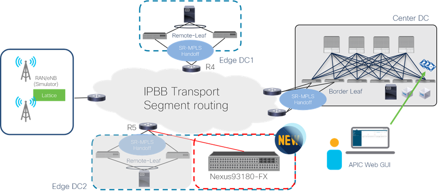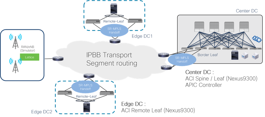 5Gショーケースのデモでは、エッジデータセンターへのネットワーク機器の展開 (Remote Leaf) と トランスポートネットワークとのセグメントルーティング連携 (SR Hand Off) を体験していただけます。
