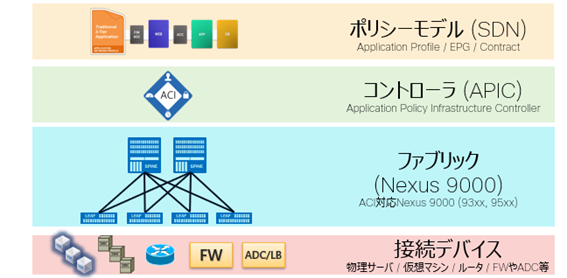 ACI はコントローラによるスイッチの集中管理や従来のネットワーク機器における各コンフィグをポリシーモデルとして抽象化し、コントローラを介してファブリック全体へ反映させる機能を提供しています。