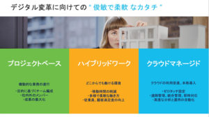 デジタル時代に最適な中小企業のカタチ、それは、プロジェクトベース、ハイブリッドワーク、クラウドインフラ型です。デジタル時代ではさらなる特質性を発揮すべく、俊敏で柔軟なカタチが求められます。